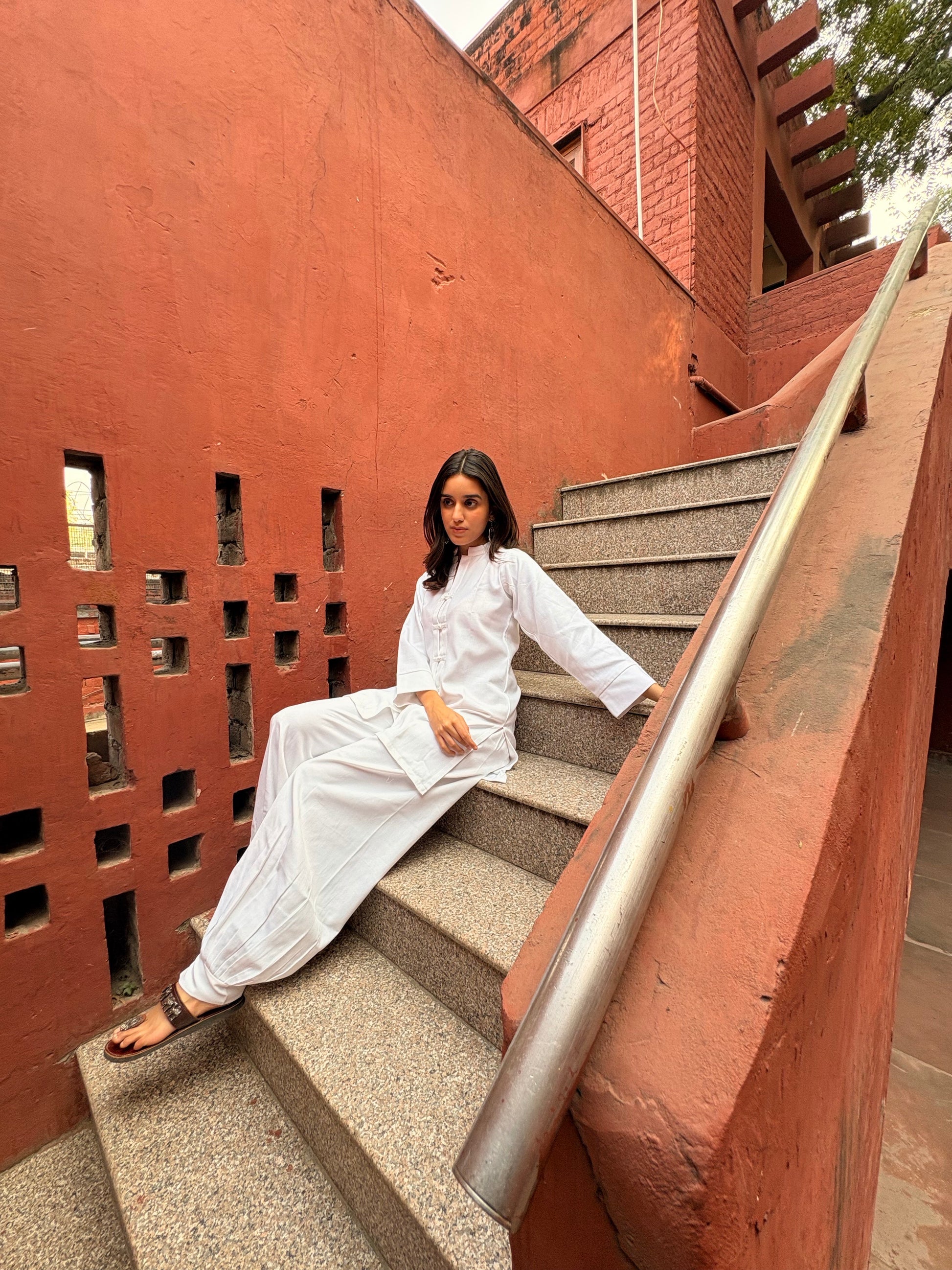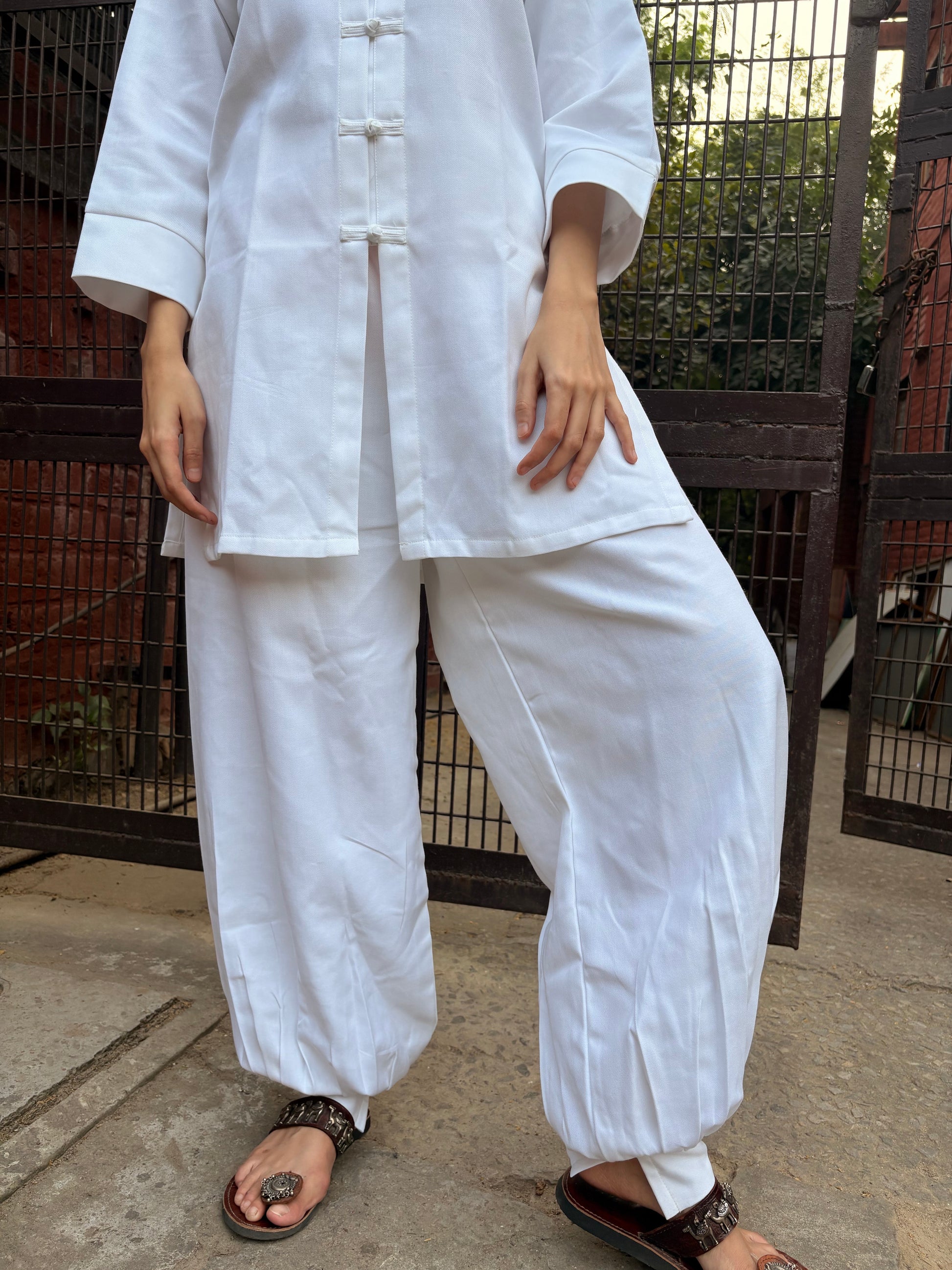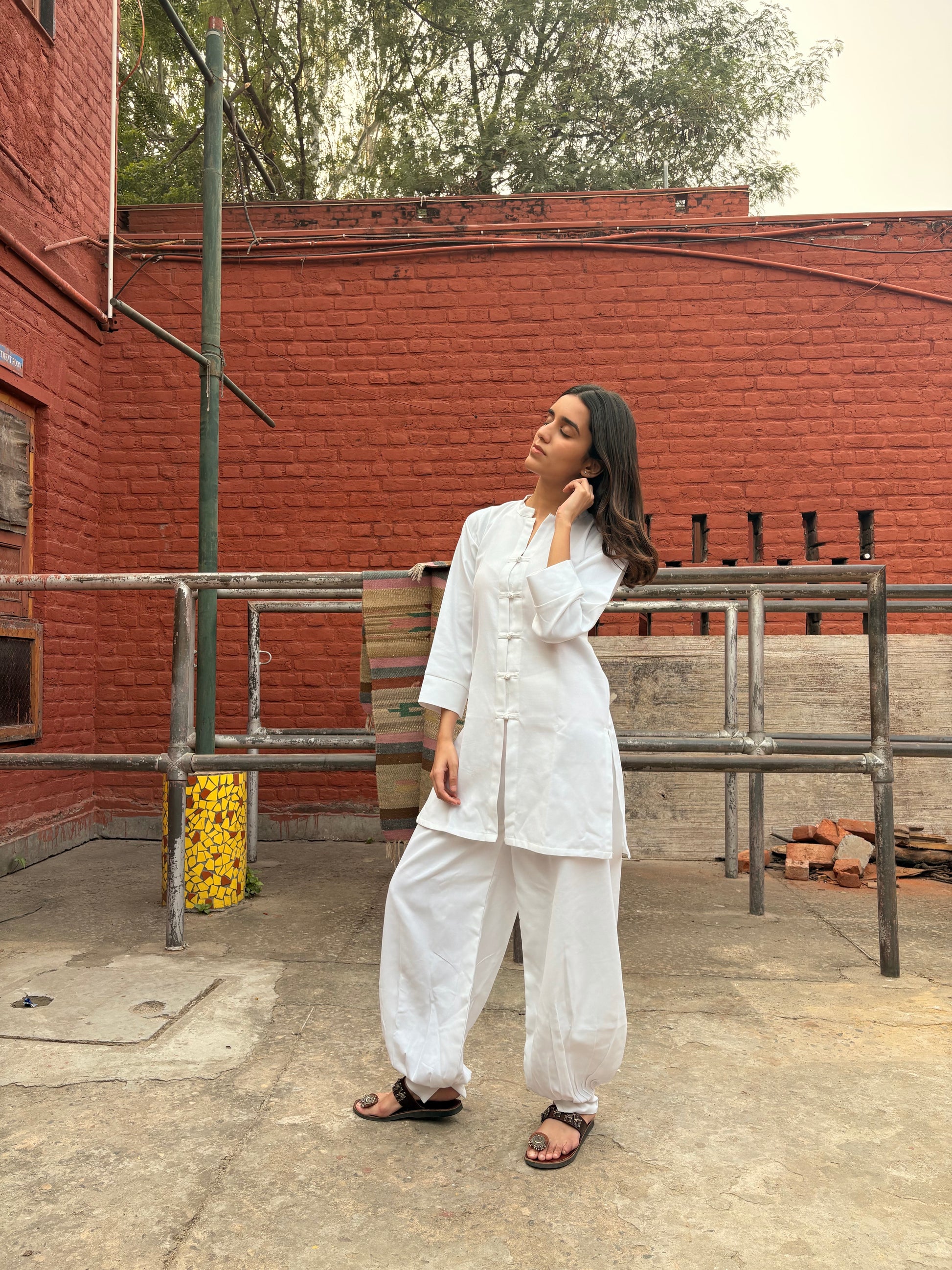 The silhouette is oversized and airy: a relaxed-fit shirt that drapes with gentle structure, paired with straight-falling bottoms that end in a subtle, balloon-shaped curve, a thoughtful detail that adds movement without losing sophistication.