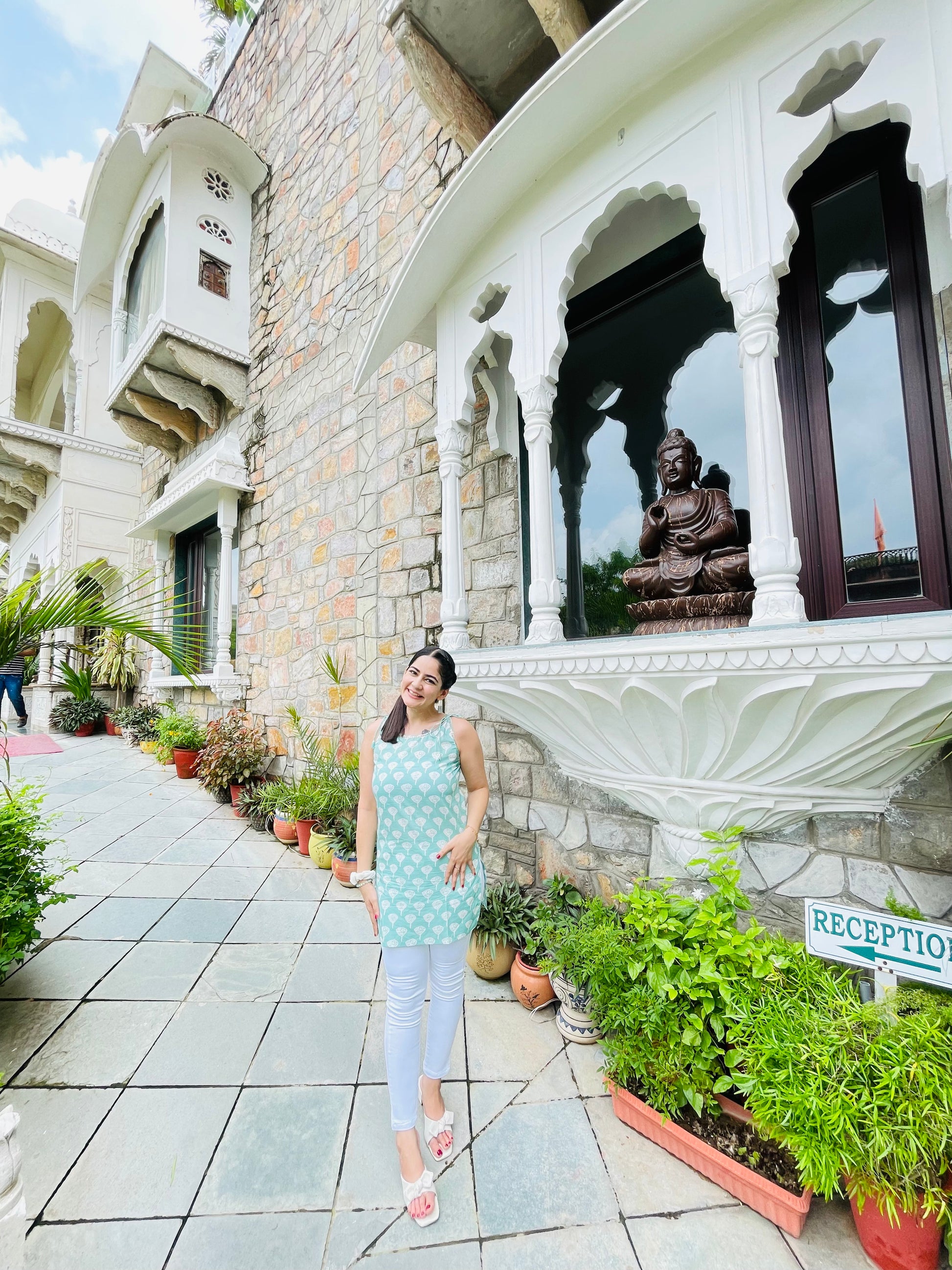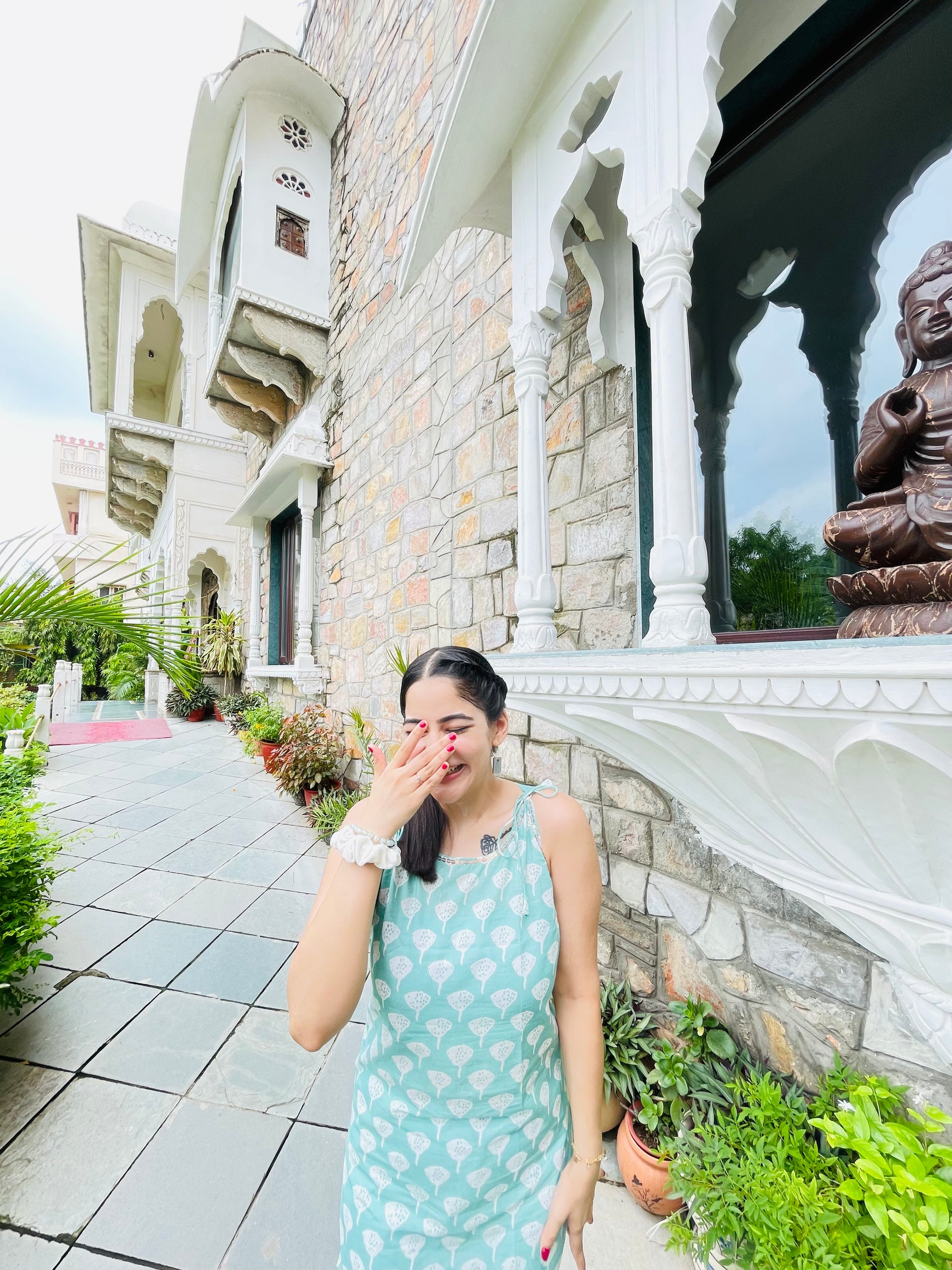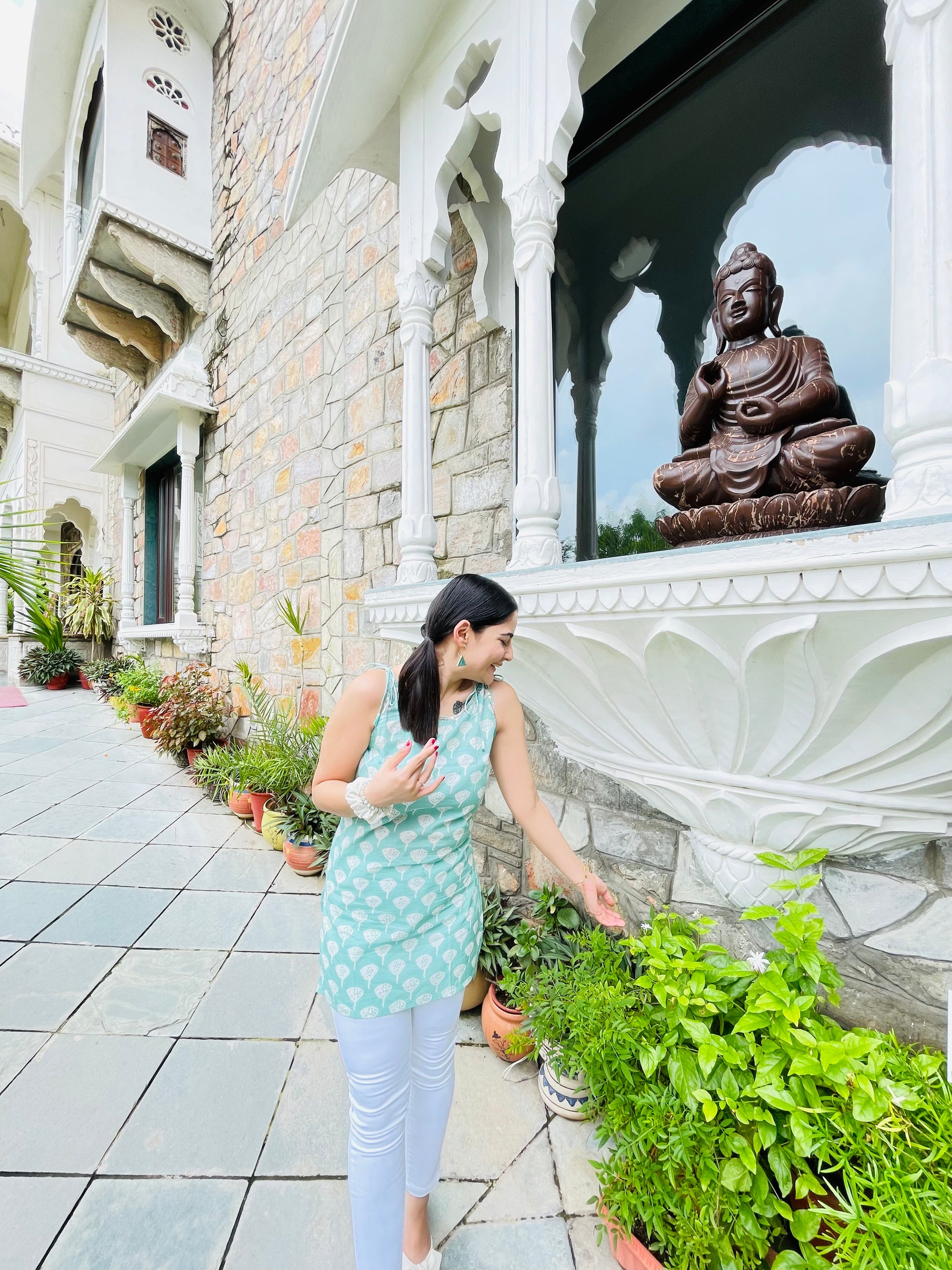 A serene blue kurti with playful white patterns, perfect for carefree strolls and sunny adventures.