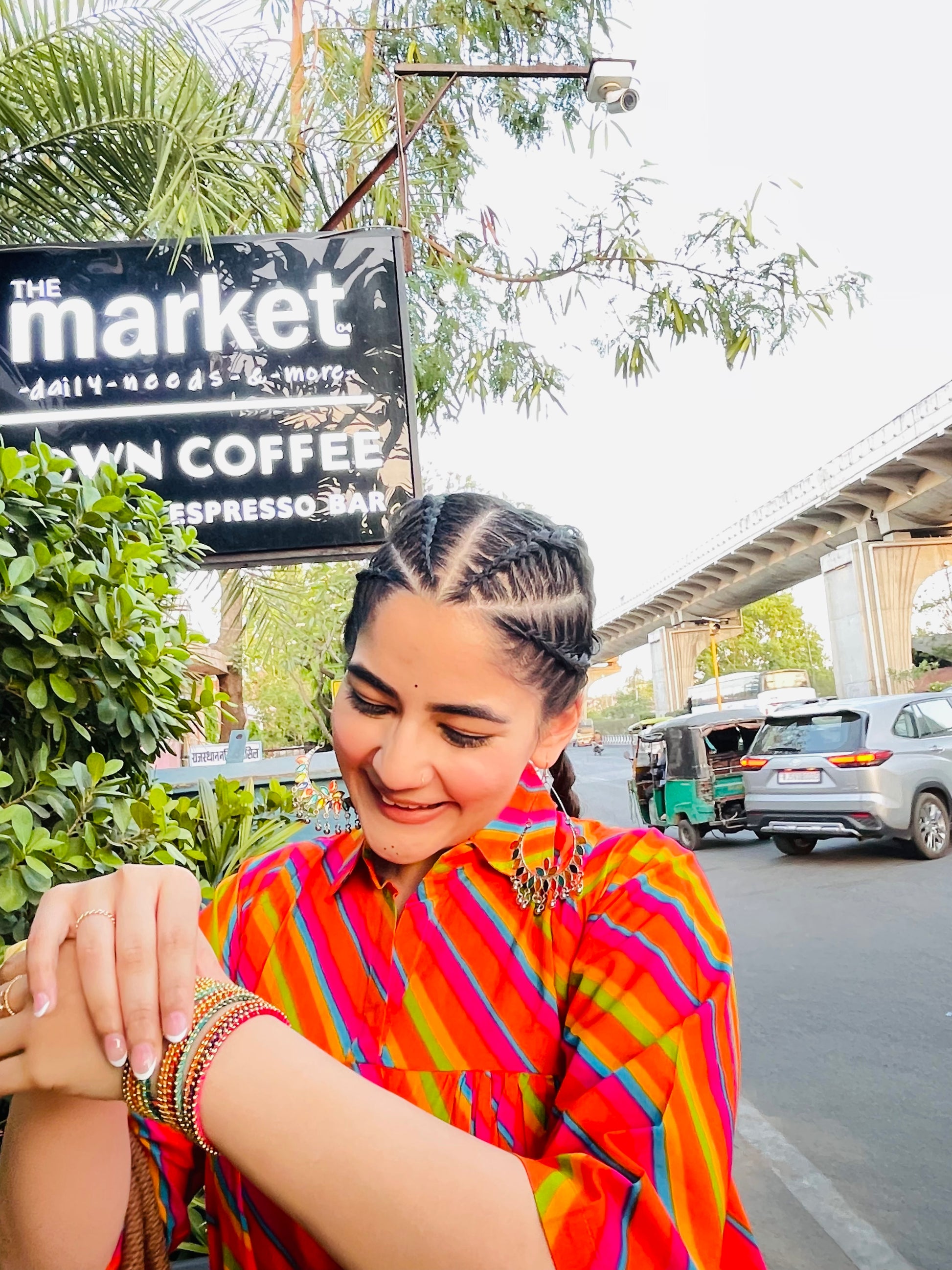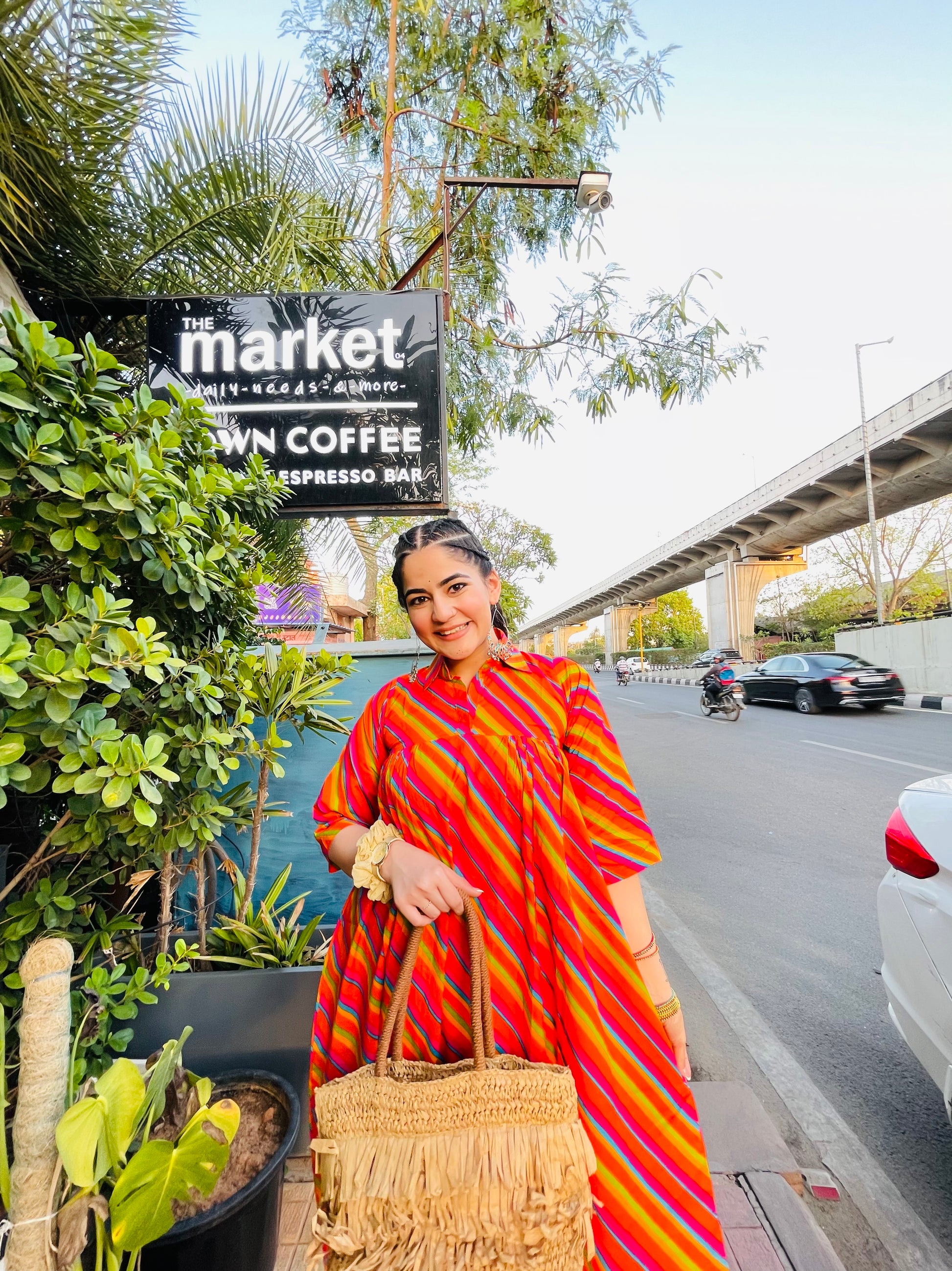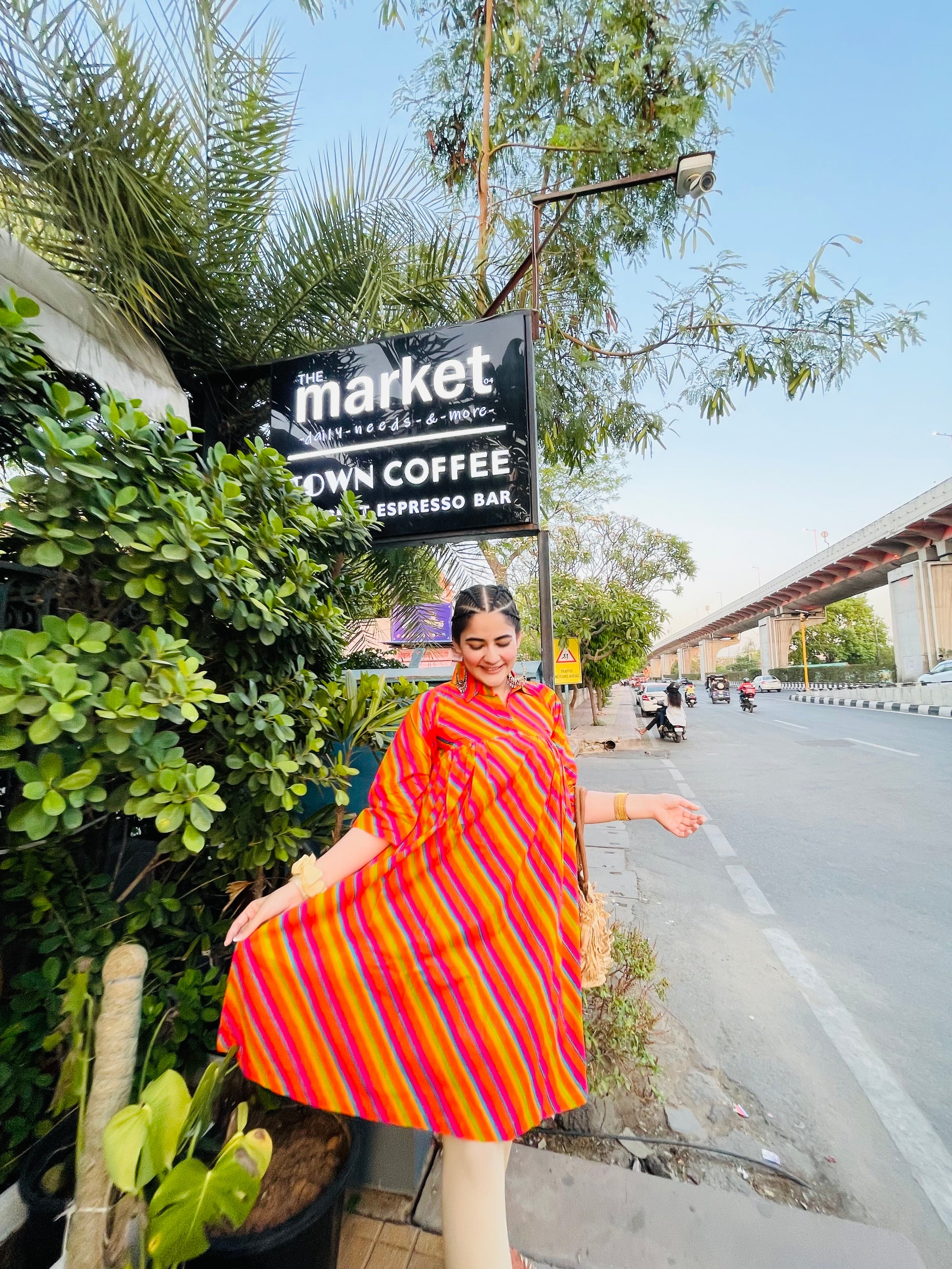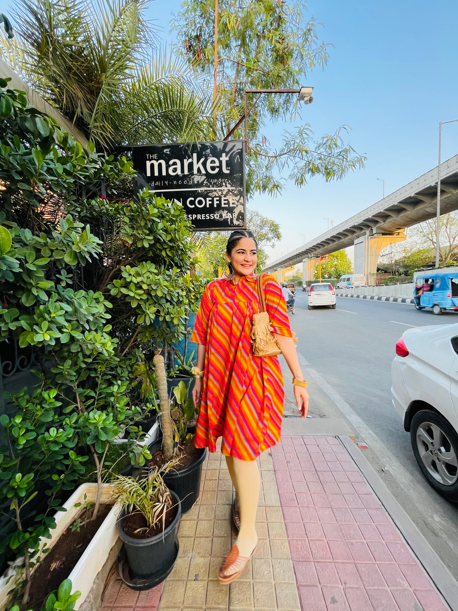Drenched in fiery shades of red, orange, and magenta, this midi dress brings together Rajasthani heritage and free-spirited modern flair. With playful stripes, a comfy silhouette, and that effortless drape, it’s made for strolls through city corners and coffee dates that turn into golden-hour photo ops.