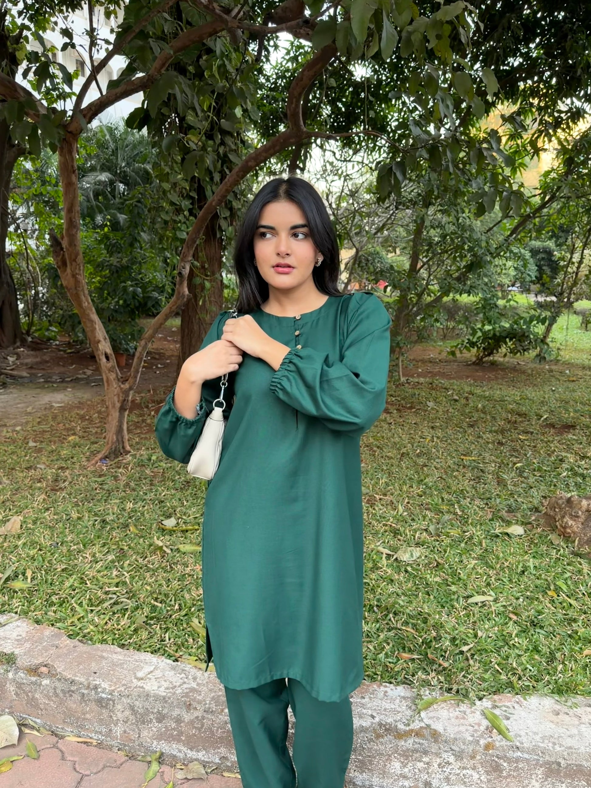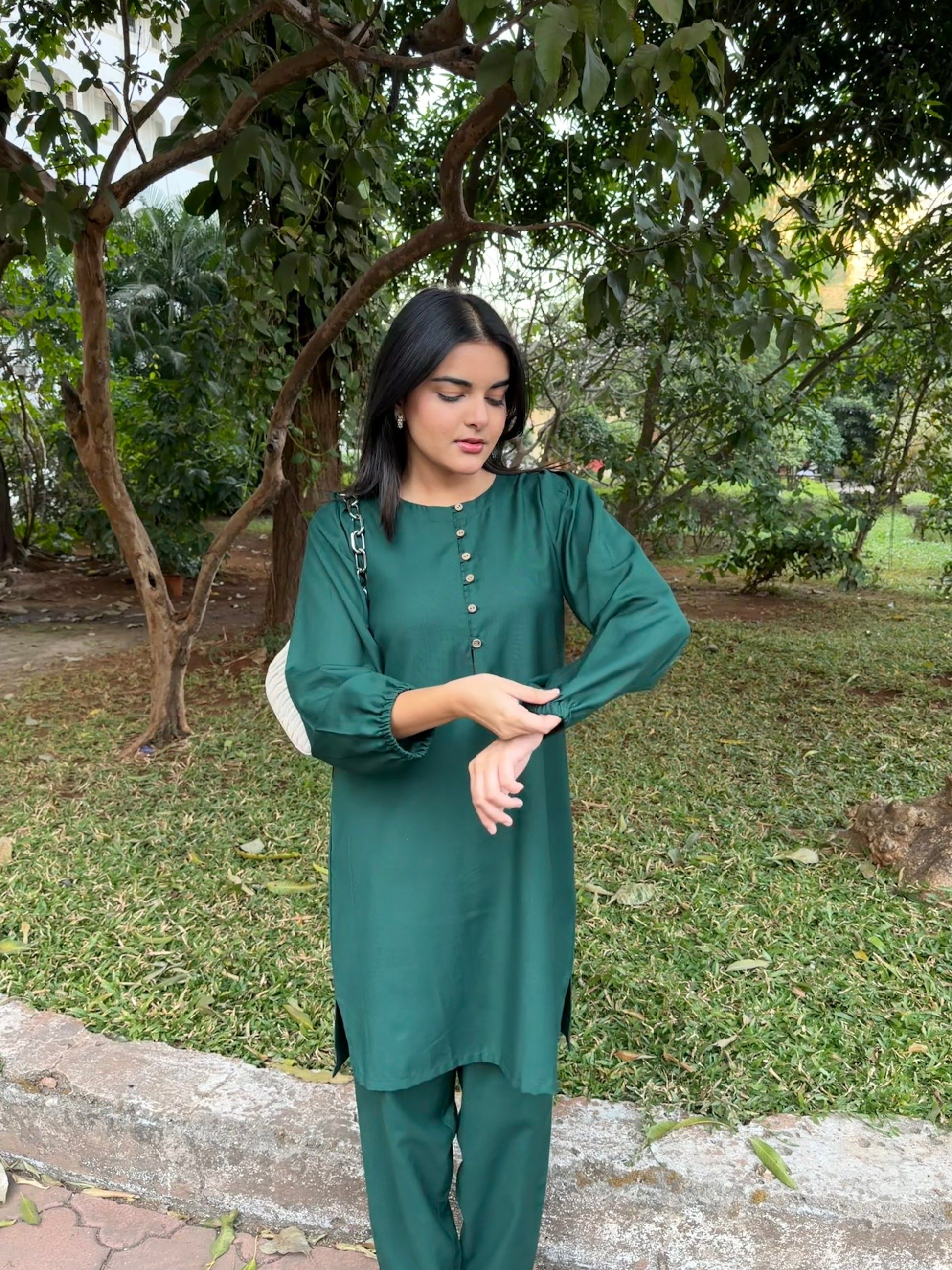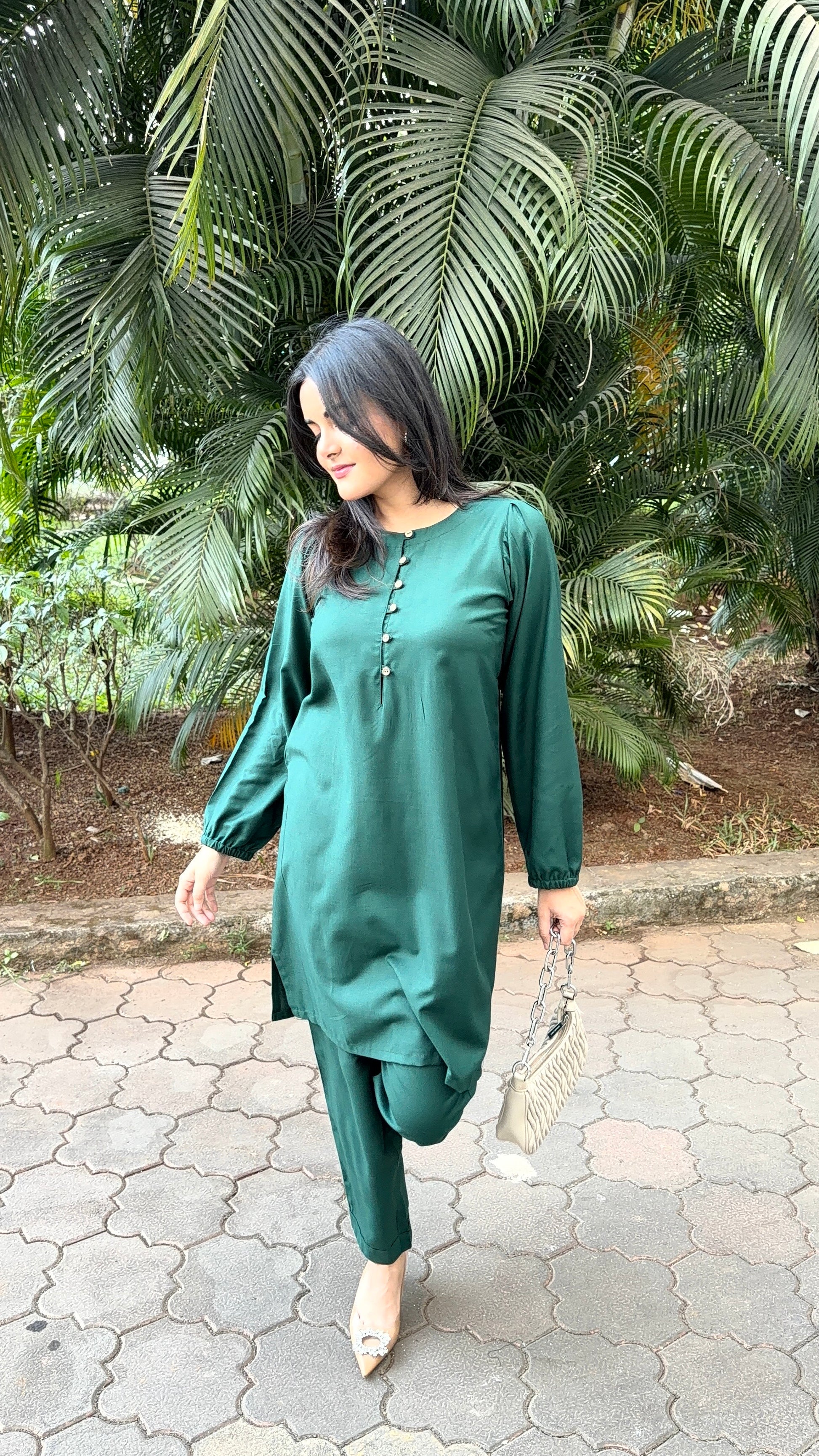 The kurta, of mid-length grace, flows with subtle authority. Ballooned sleeves tied delicately at the ends mirror the soft cinch at the pant hems, creating harmony in movement. Front buttons trace a line down the deep green canvas, giving a calm rhythm to an otherwise bold silhouette. Every fold, every curve, every tied end turns a simple ensemble into a statement of style and intent.