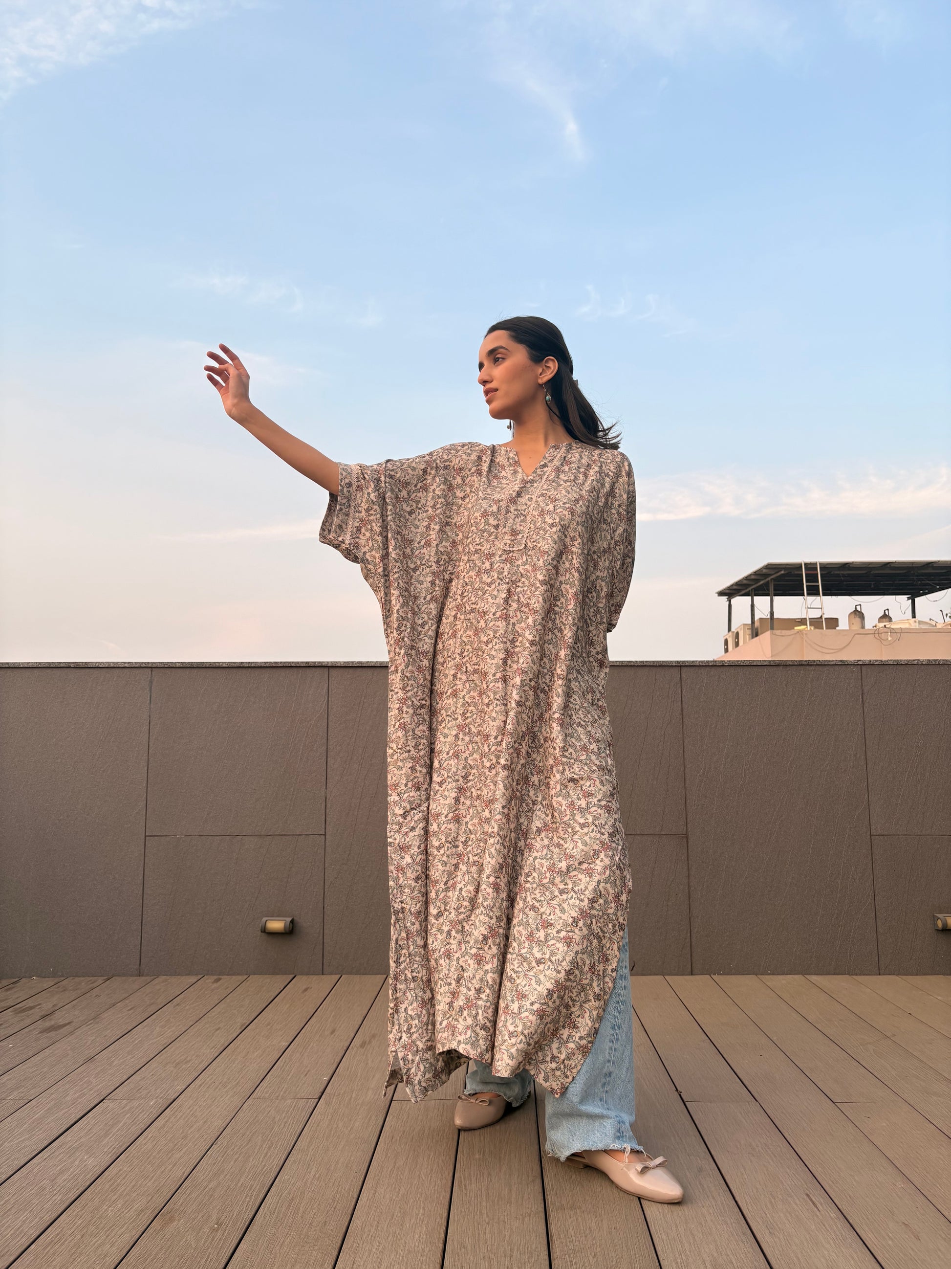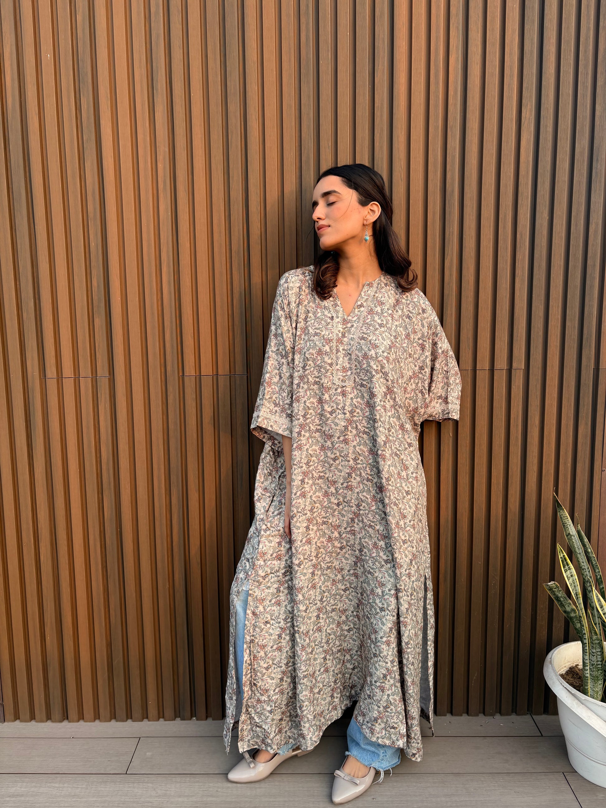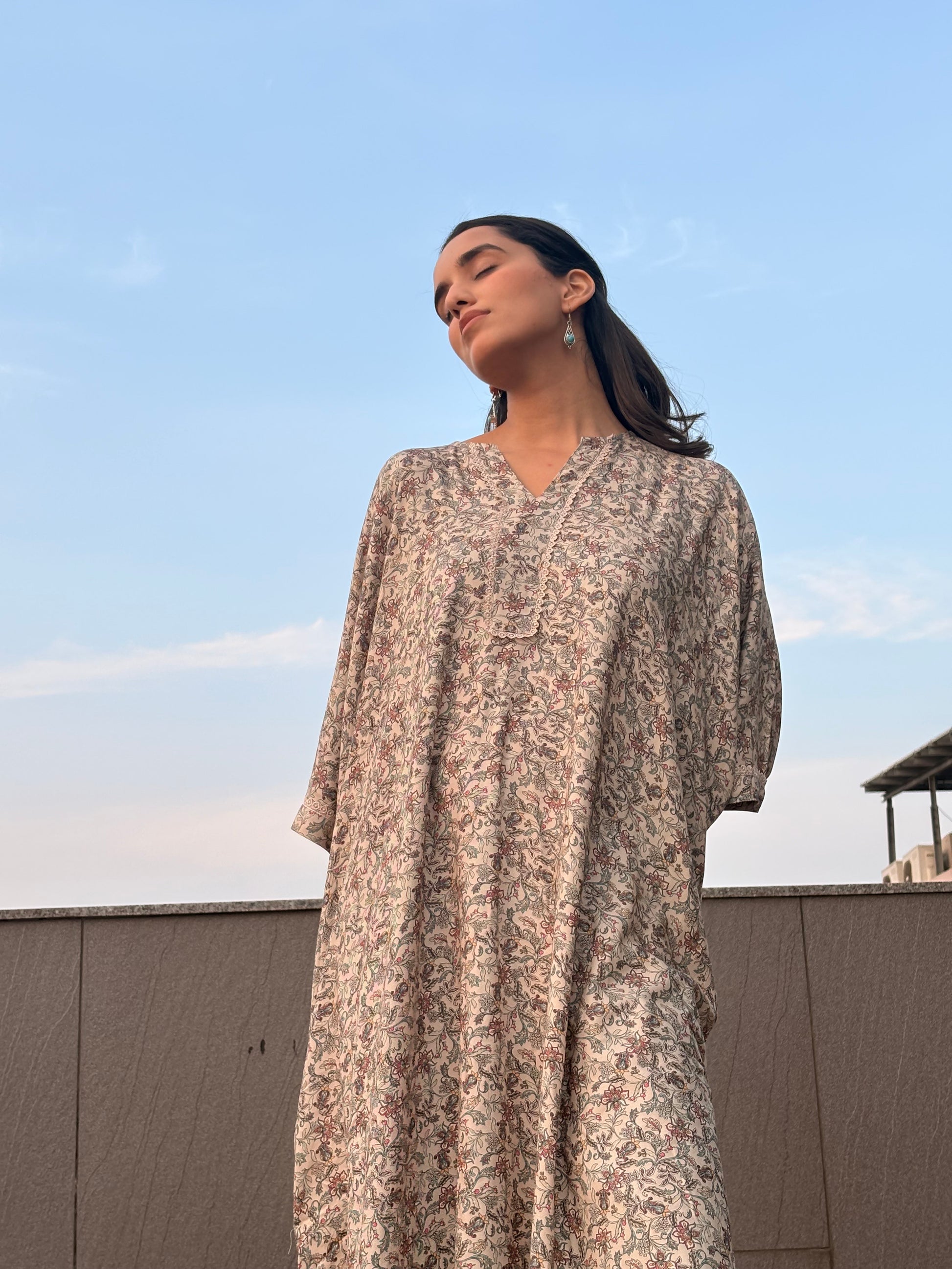 Multicolour floral and leaf motifs bloom across the fabric, adding little bursts of joy against the calm canvas. Side slits trace the edges with movement, while delicate lace work softens the look further, giving the kaftan a charm that feels both handcrafted and timeless.