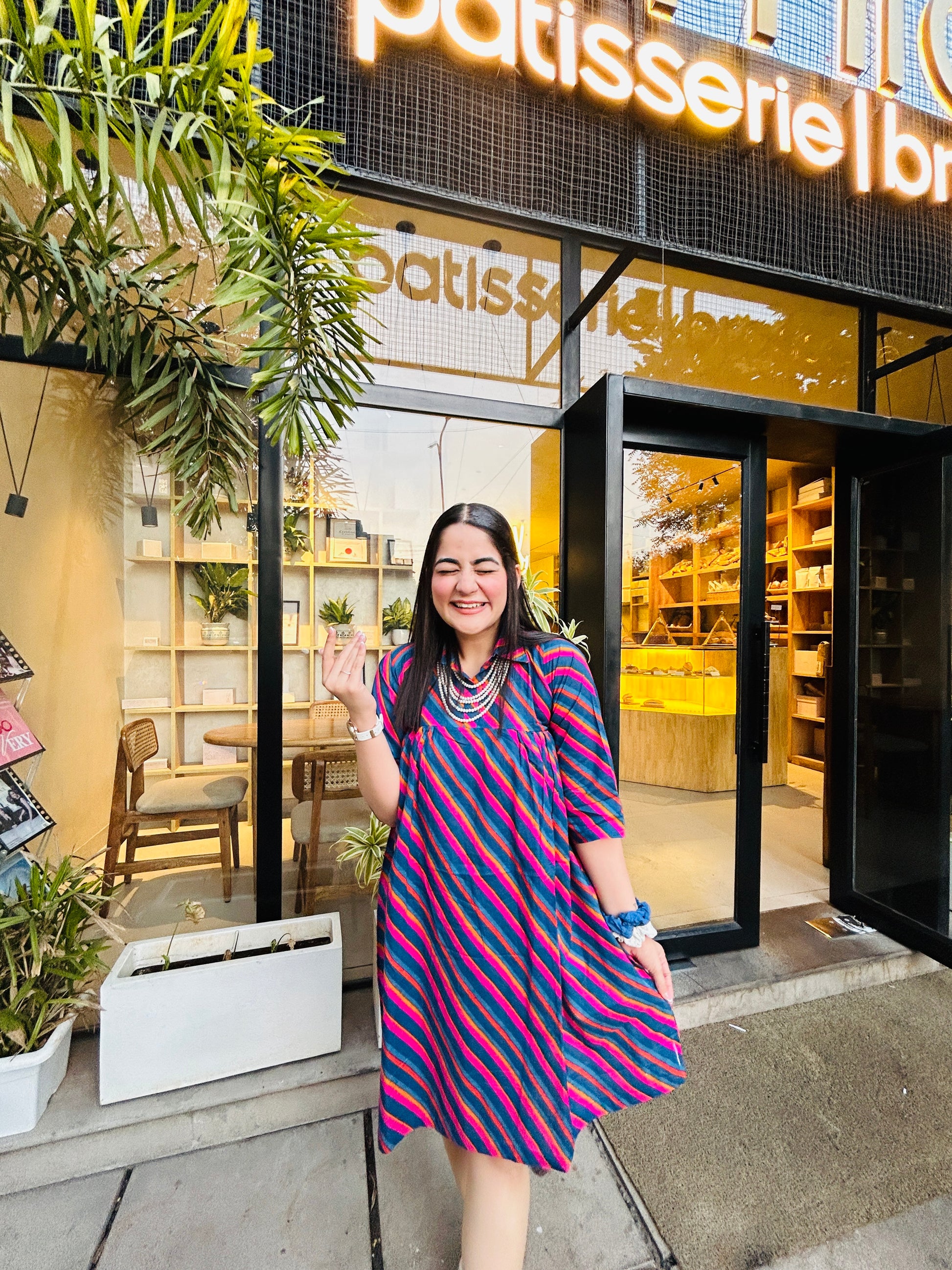 Featuring bold waves of magenta, electric blue, and golden saffron, this easy-breezy silhouette flows like the evening breeze. With its flattering midi length, soft cotton comfort, and iconic Rajasthani Leheriya print, this dress is designed for those who carry culture with confidence.